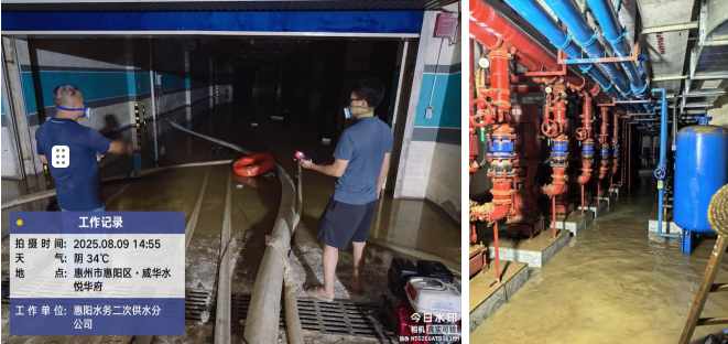 在惠陽(yáng)區委、區政府統一領(lǐng)導部署下,惠陽(yáng)水務(wù)啟動(dòng)一級應急響應,集結搶險隊伍、備齊材料,準備隨時(shí)搶修。為保障群眾用水,公司主動(dòng)與政府、物業(yè)協(xié)調,派出人員、提供技術(shù),助力相關(guān)小區早日恢復供水。此次搶險難度遠超預期:多個(gè)受淹地下室面積大、積水深,排水系統癱瘓,排水時(shí)間長(cháng);洪水退后室內有害氣體嚴重超標,搶修難度增大;供水設備長(cháng)時(shí)間浸泡受損,清淤檢修要在泥濘積水中進(jìn)行,給搶修人員帶來(lái)極大考驗。